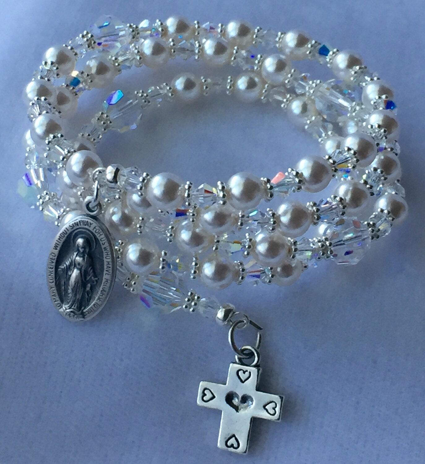 Sterling Silver Pearl Rosary Bracelet - Five Decade Wrap Rosary Bracelet - First Communion Rosary Bracelet - Memory Wire Rosary Bracelet - Children Rosary Bracelet - Confirmation Rosary Bracelet - Religious Jewelry - Wrap Rosary Bracelet - Catholic Rosary - Catholic Jewelry - Rosary Jewelry - Cross Charm - Miraculous Medal - Pearl Rosary - My First Rosary Bracelet - Especially Weddings - Anniversaries - Birthdays - Confirmation - First Holy Communion - RCIA Neophytes.