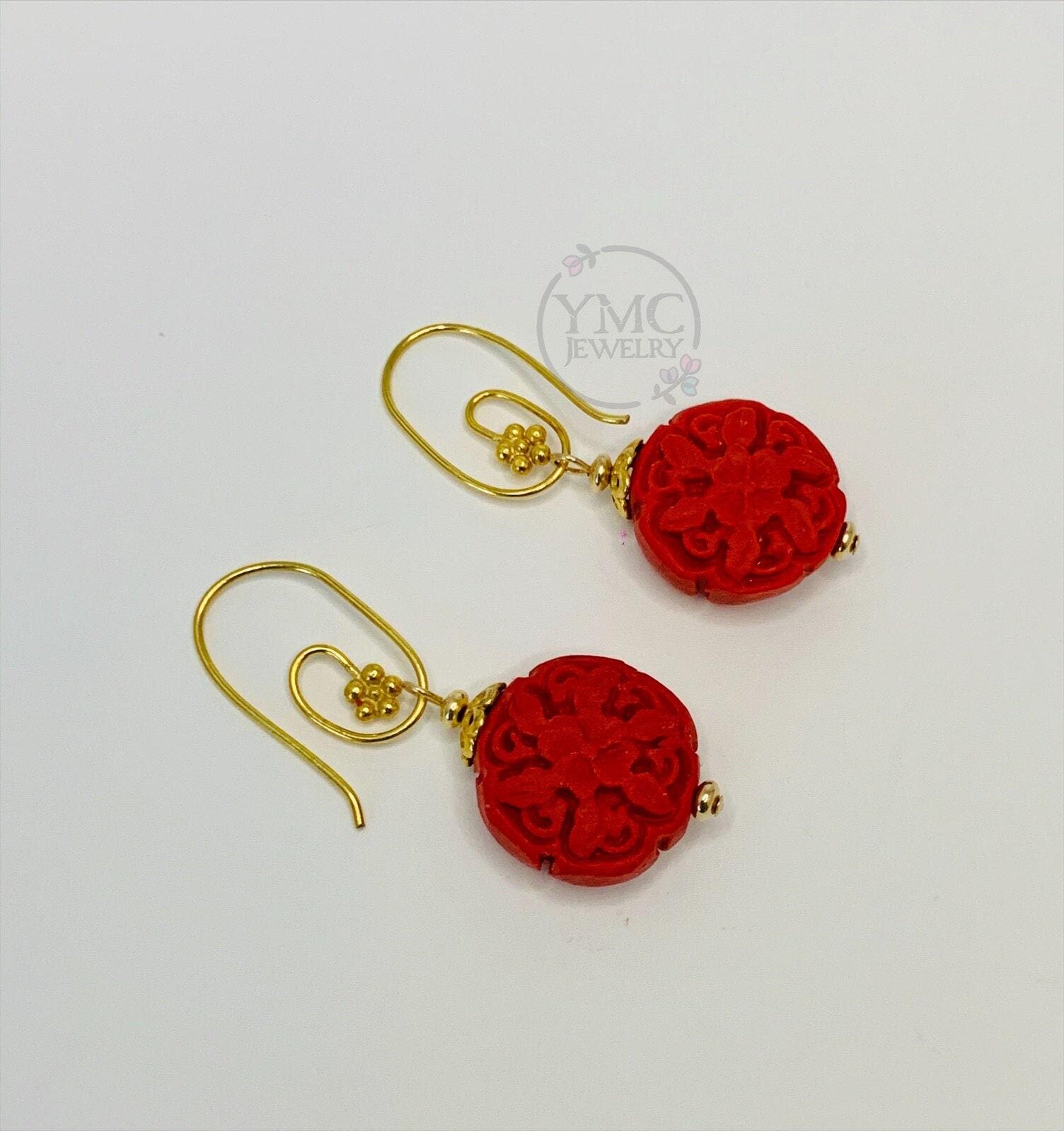 This beautiful red carved cinnabar earrings: are made with coin flower-shaped carved cinnabar beads topped with vermeil caps, dangle from 22x12mm, Bali Artisans, 24K Vermeil Sterling Silver Fancy Earwire with a 5mm Daisy. The material used is 24K Vermeil Sterling Silver and 14Kt Gold Filled