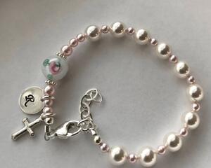 Pink Initial Baptism Pearl Rosary Bracelet,First Communion Br...