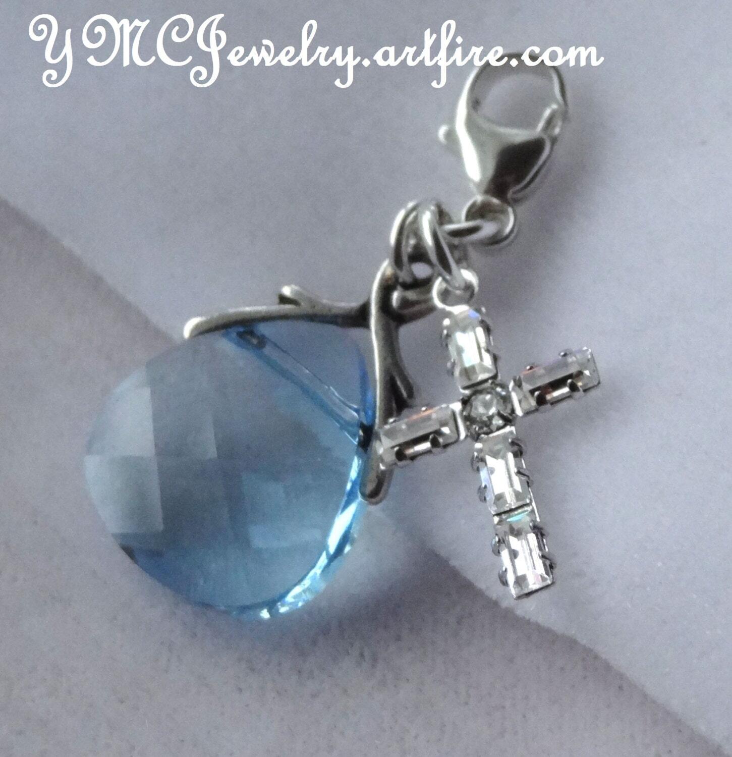 This Something Blue Cross Bridal Bouquet Charm it was created with an original European PRESTIGE crystal large aquamarine briolette, crystal cross, and silver bail. The charms hangs from .925 sterling silver lobster clasp. The jump rings are sterling silver too. All parts are 925 sterling silver
